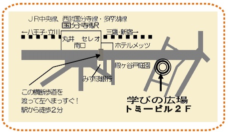 国分寺駅(JR中央線、西武国分寺線・多摩湖線)南口を出て、みずほ銀行前 の横断歩道を渡って、徒歩2分です。